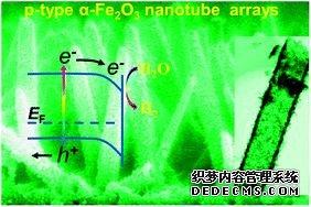 中科院理化所師文生課題組在具有ZnO陣列的FTO上,用電沉積的方式制備了FeOOH,通過高溫離子擴散的方式使Zn2+摻雜入Fe2O3, 后去除ZnO模板獲得了p型Zn2+摻雜Fe2O3的空心納米管光陰,并展現出了較高的開啟電勢。(上圖,DOI:10.1039/C3CC40599K)