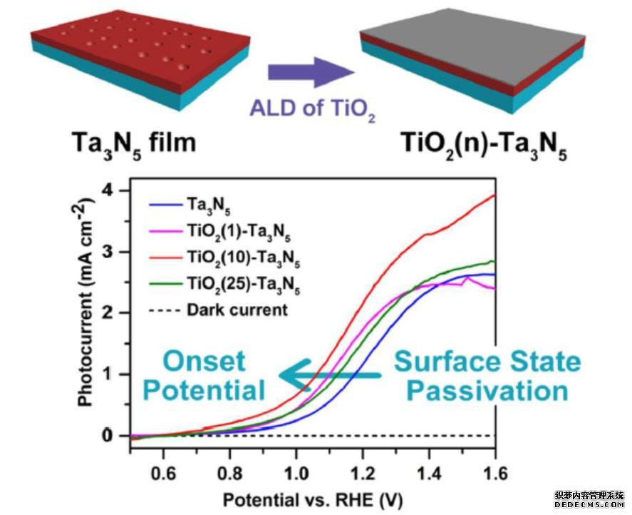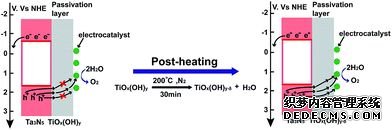 在對TiO2鈍化層的研究中,羅文俊課題組通過化學浴沉積的方法在Ta3N5上制備了一層TiO2,并且發現水溶液法制備的TiO2中含有的羥基基團會影響電的性能。
