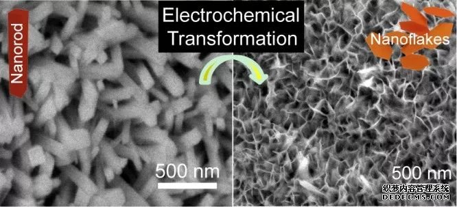 Yat Li課題組通過對Fe2O3納米棒進行電化學誘導,生成了約10 nm 厚的納米片狀Fe2O3,其光電流也提高了3倍。(上圖,DOI:10.1016/j.nanoen.2014.12.023)