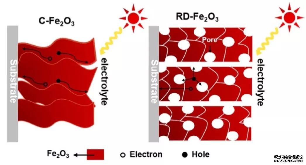 但是,Fe2O3同時也存在著吸光系數差、光生空穴傳輸距離短(2~4 nm) 等限制因素,導致了目前基于Fe2O3光陽的光電轉化效率依舊較低。由于Fe2O3的空穴傳輸距離太短,因此對Fe2O3的微納結構調控顯得尤其重要。