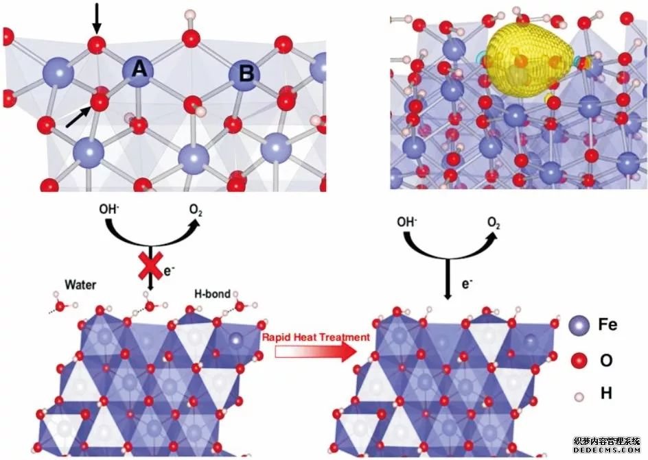 羅文俊課題組發現通過高溫短時間煅燒除去α-FeOOH 表面吸附水的方法,可以提高α-FeOOH 的產氧活性和穩定性,通過理論計算發現,表面吸附水會與FeOOH 表面的O形成強的氫鍵,影響活性位點對OH- 的吸附和氧化,從而影響了其產氧的活性。 (DOI:10.1039/C6TA08719A)