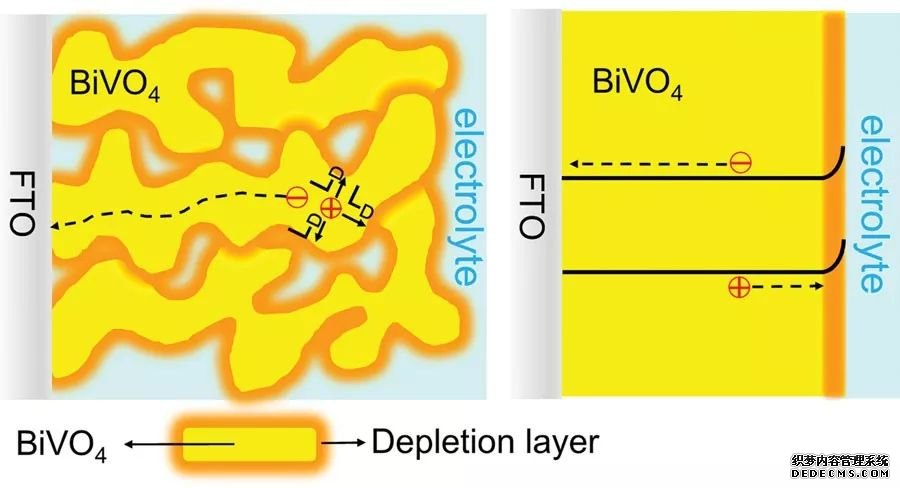 多孔結構的BiVO4電由于減少了反射和透射,對光的吸收要高于平板結構電。 此外,多孔結構減少了光生空穴的傳輸距離,提高了光生載流子的分離效率,使光電流相比于致密電有了明顯的提高。但多孔結構的光電也不是孔越多越好。 (上圖,DOI:10.1002/aenm.201301785)