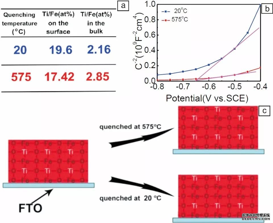 除了在材料制備后對表面偏析相進行處理外,黃維院士團隊對Fe2O3的煅燒過程進行改進,發現通過短時間淬火的方式,能夠在制備過程中就降低表面的偏析、提高體相摻雜濃度,從而提高Fe2O3電的性能。XPS表征發現,通過短時間高溫淬火可以有效降低Fe2O3表面的Ti偏析, 莫特肖特基曲線也發現高溫淬火后的載流子濃度相比于 常溫取出的Fe2O3高了6 倍,因此他們認為高 溫淬火的方式可以將摻雜離子固定在材料晶格內部,防止向表面偏析,從而減小表面復合,提高材料光電化學性能。(上圖,DOI:10.1002/cnma.201600108)