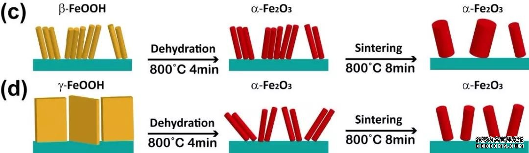 Yilin Liu等發現 FeOOH的晶相結構會對煅燒過程有影響:當FeOOH 為緊密堆積的β相時,煅燒過程中納米棒會燒結,終得到的Fe2O3納米棒會比較粗(約65nm);而當FeOOH為層狀結構的γ相時,煅燒過程中結構會脫水斷裂,能生成超細結構的納米棒(約20 nm) ,其光電流相比于直徑較粗的Fe2O3,也有了1.5 倍的提升。(上圖,DOI:10.1088/1361-6463/aa6fb7)