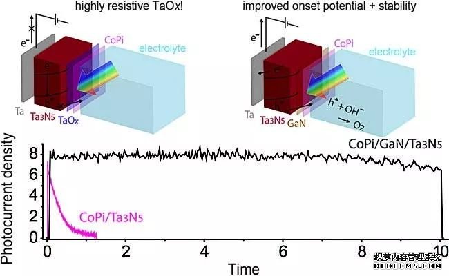 Kazunari Domen教授課題組在Angew發表的一篇文章中,通過在Ta3N5表面引入GaN 鈍化層,使原本 在1 h 時光電流就幾乎衰減為零的Ta3N5電的穩定性提 高到了12 h 以上幾乎沒有太大衰減,并且其法拉第效率保持100%。(上圖,DOI:10.1002/anie.201700117)